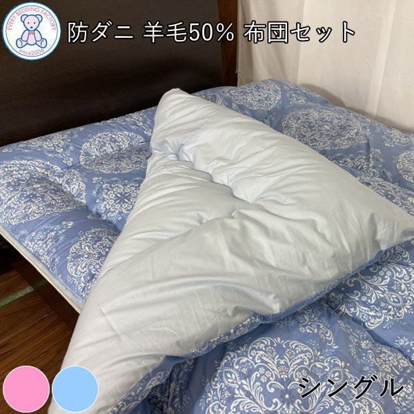 防ダニ 抗菌 防臭 羊毛混 布団セット シングル 日本製 掛け布団 150×200cm 敷き布団 100×200cm フランス産ウール50% 帝人マイティートップ2ECO ポリエステル50% ピンク/ブルー