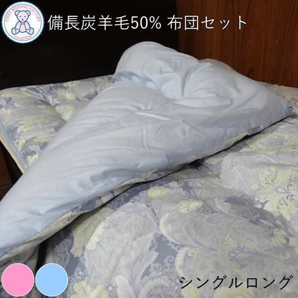 備長炭 羊毛混 布団セット シングルロング 日本製 掛け布団 150×210cm 敷き布団 100×210cm フランス産ウール50% ポリエステル50% 紀州南部備長炭シート ピンク/ブルー